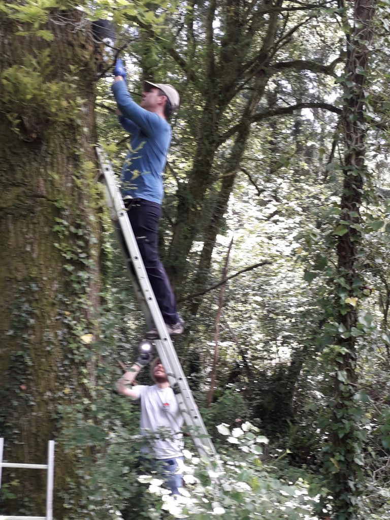 Josh led a small team first around Kings Castle Woods guided by reserve warden Tom. A couple of Soprano Pipistrelles were found in the existing boxes, and three more erected, making a total of 14 bat boxes on the site.