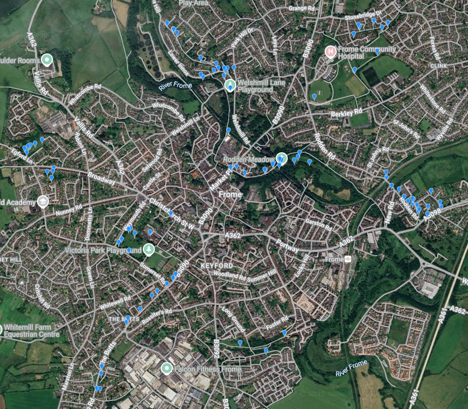 - Bat map of the 61 verifiable bat recordings from Frome Big Bat Count 2/5/25