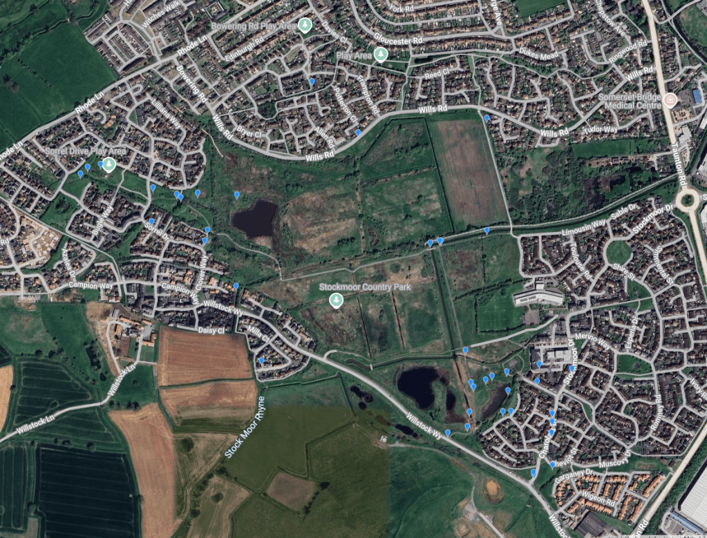 Bryony from the Wildlife trust was running this count for Stoke St Gregory Environment Group. On “a really lovely evening weather wise” around 14 people set off to hunt bats, but due to issues with the new iNaturalist iPhone app there were fewer groups than hoped, so everyone could have an Android in their group.