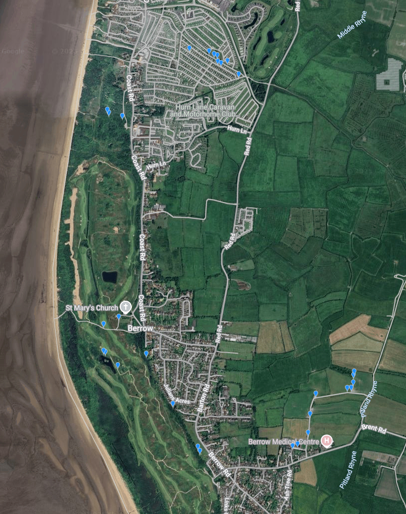 Common Pipistrelle were by far and away the most frequently seen, but Soprano (Pygmy) Pipistrelle were also recorded south of St. Mary’s Church. Serotine where recorded east of Berrow village. While a single recording of a possible Nathusius’ Pipistrelle near the pond south of St. Mary’s Church which will need more validation.